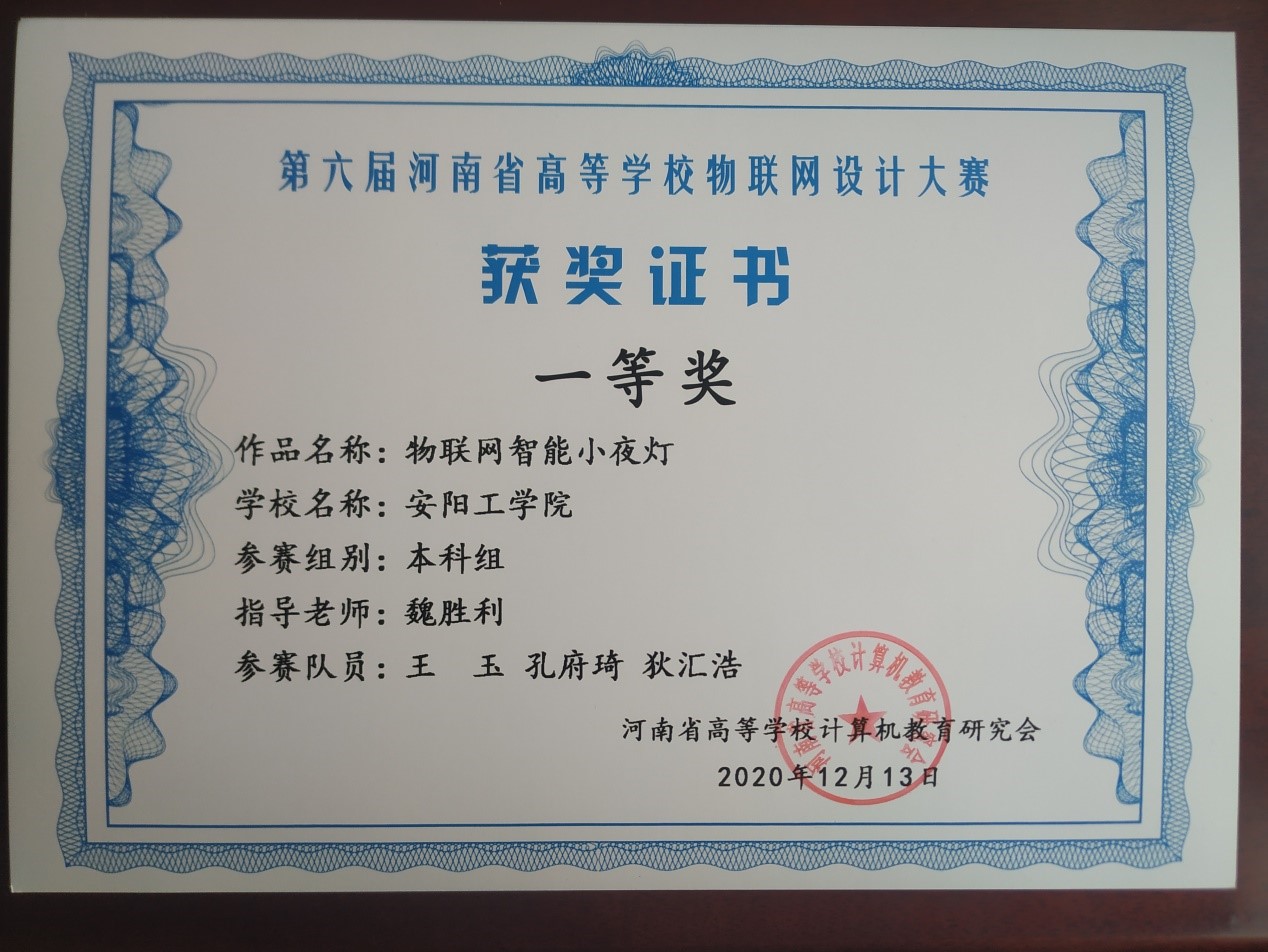 由河南省高等公司计算机教育研究会主办的第六届河南省高等公司物联网设计大赛于上周落下帷幕。此次大赛吸引了包括郑州大学、郑州轻工业大学、河南理工大学在内的二十多所高校参赛。经过线上作品展示与答辩,公司beat365中文官网物联网工程专业王玉等同学设计的“物联网智能小夜灯”获一等奖,娄士龙等同学设计的“物联网智能窗帘”获二等奖。