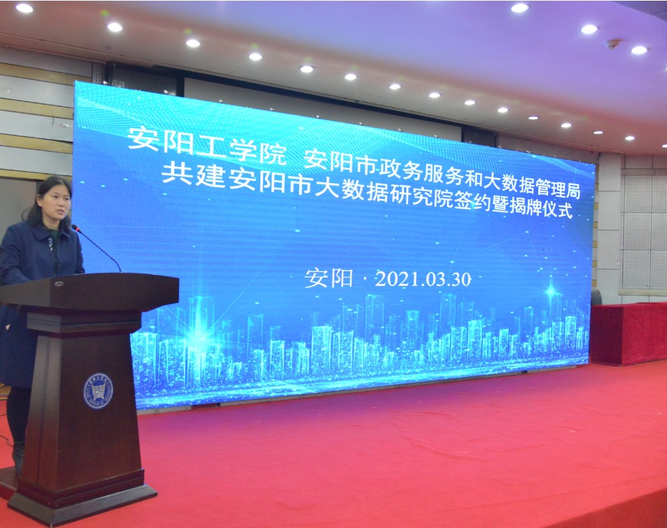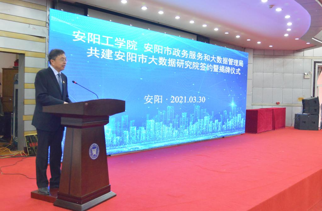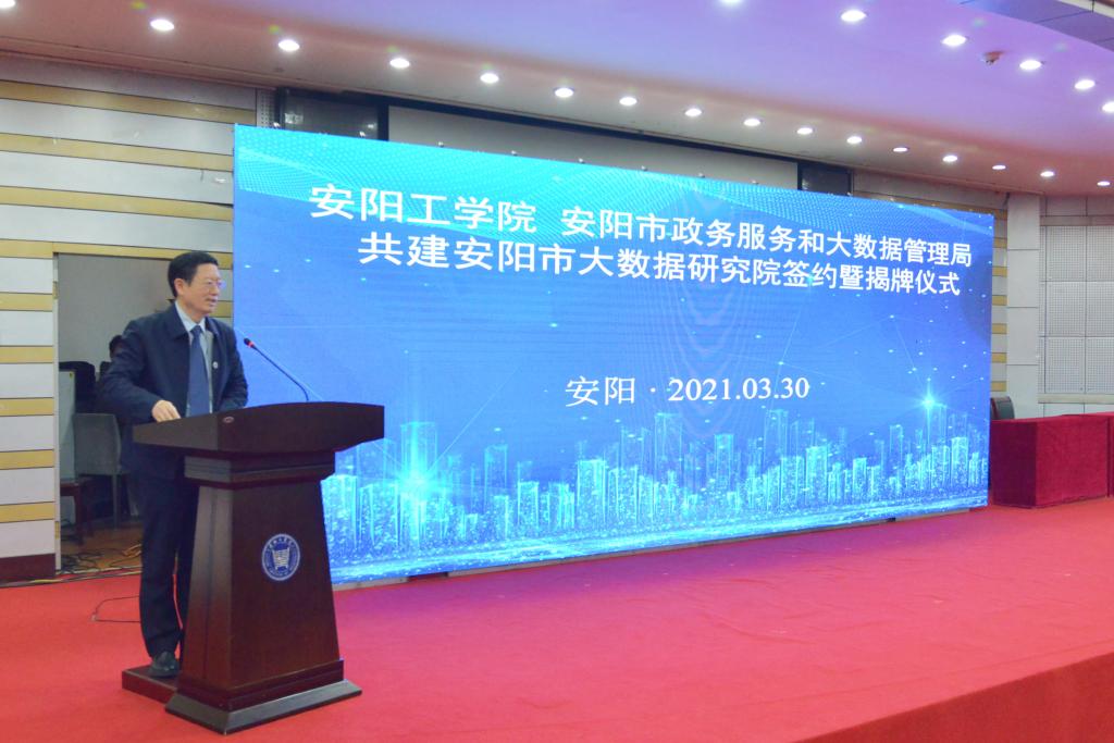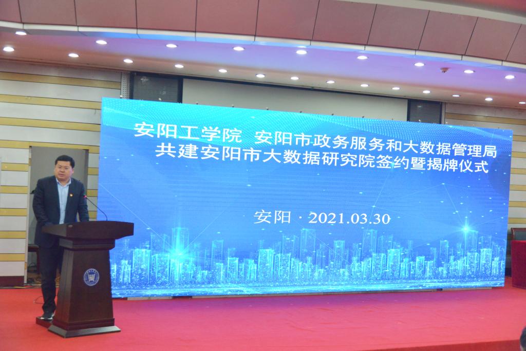 3月30日上午,公司与安阳市政务服务和大数据管理局共建安阳市大数据研究院签约暨揭牌仪式在锦江之星学术报告厅隆重举行。河南省大数据管理局党组成员、副局长朱明,河南省教育厅高教处副处长季双丽,安阳市政府副秘书长王金波,公司党委书记任中普,董事长景国勋,副董事长万鹏杰、郭秋平,安阳市政务服务和大数据管理局局长王福生,河南省大数据局发展规划处副处长赵永威,河南省大数据局数据资源处副处长管涛,安阳市高新区管委会常务副主任牛福生等领导出席仪式。安阳市大数据研究院各理事单位代表、beat365中文官网师生代表等200余人参加仪式。副董事长万鹏杰主持仪式。